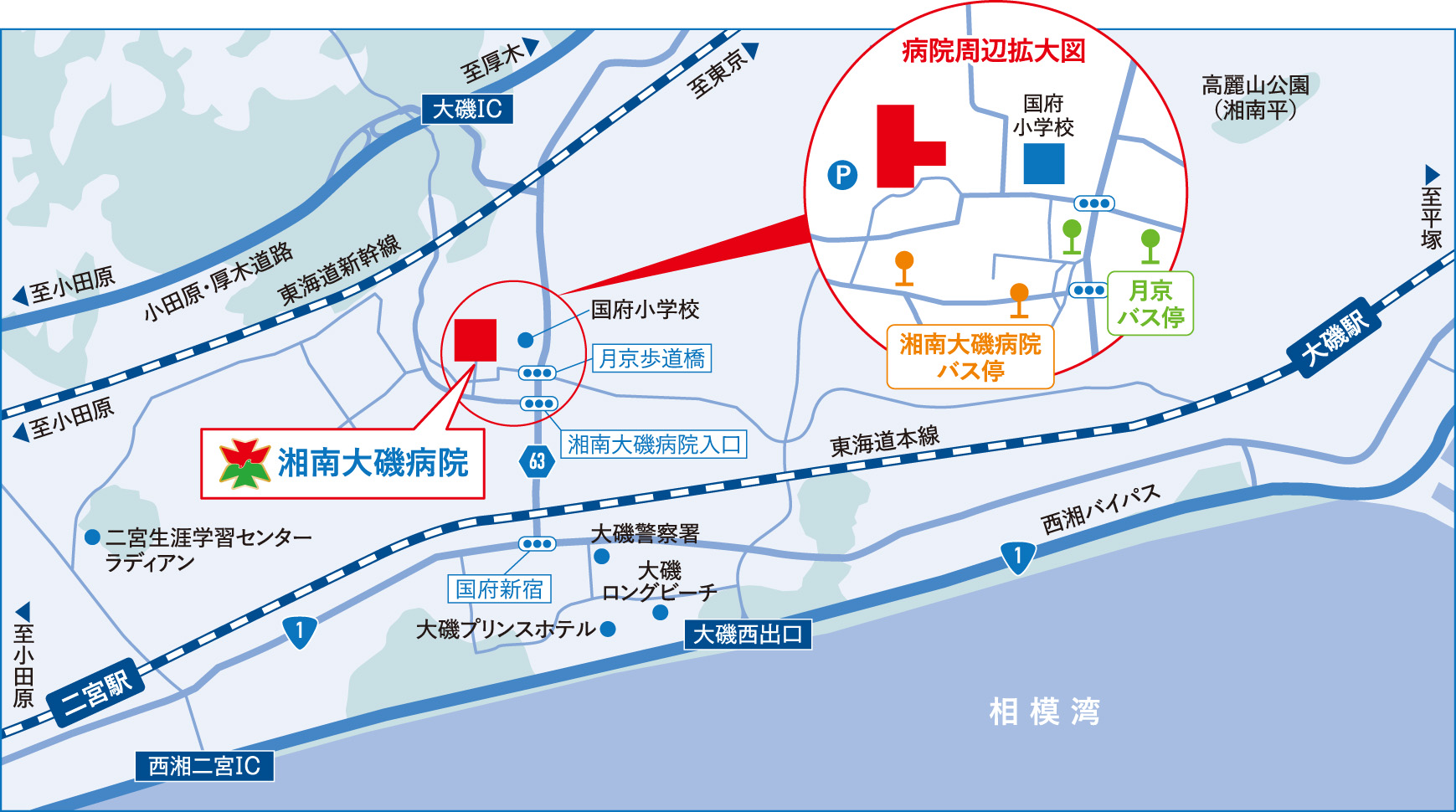 ※最寄りのバス停は「湘南大磯病院」と「月京」です。