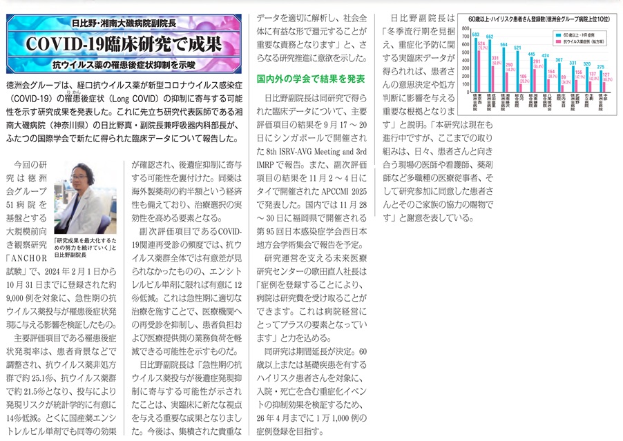 【徳洲新聞】日比野 副院長が紹介されました。 2025年11月26日 お知らせ 徳洲新聞1519号にて日比野 副院長が「COVID-19臨床研究の成果」という記事で紹介されました。 詳細はこちらをご覧ください。