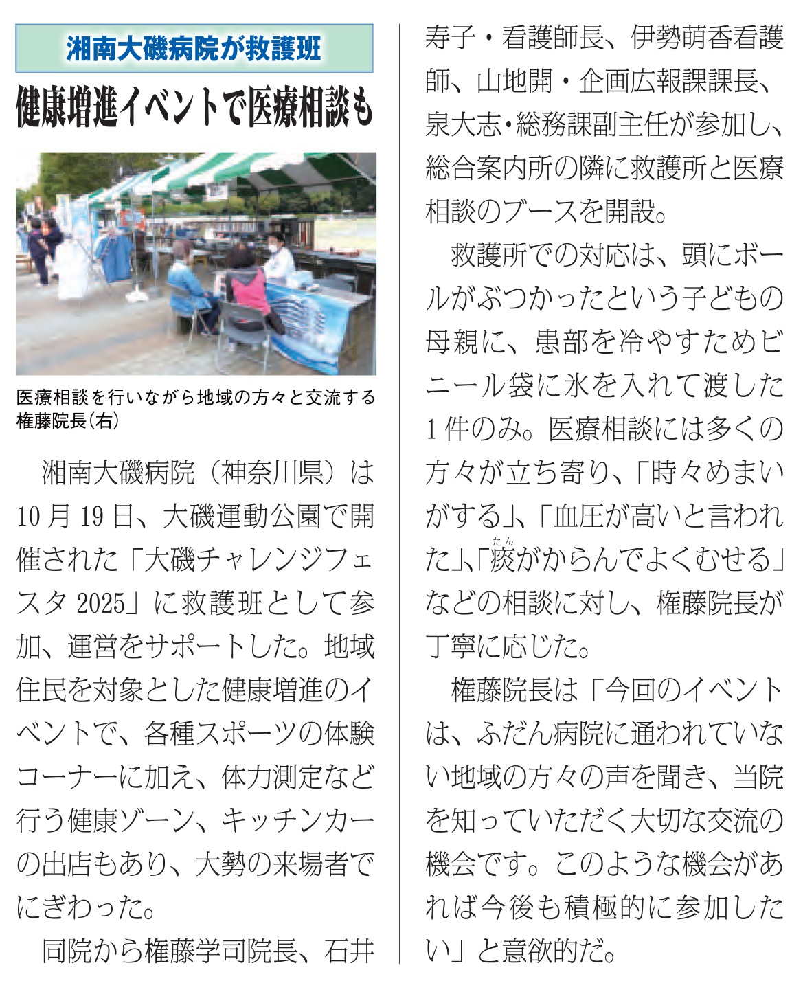 【徳洲新聞】「大磯チャレンジフェスタ」に参画したことが紹介されました。 2025年12月3日 お知らせ 徳洲新聞1520号にて、「大磯チャレンジフェスタ」に参画したことが紹介されました。 詳細はこちらをご覧ください。